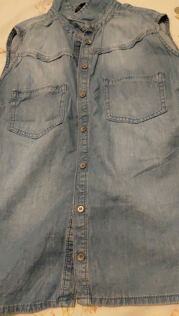 Düğmeli, yakalı ve kolsuz mavi kot gömlek. Rahat kesimi ve midi boyuyla gündelik kullanıma uygundur. İki ön cep bulunur.
