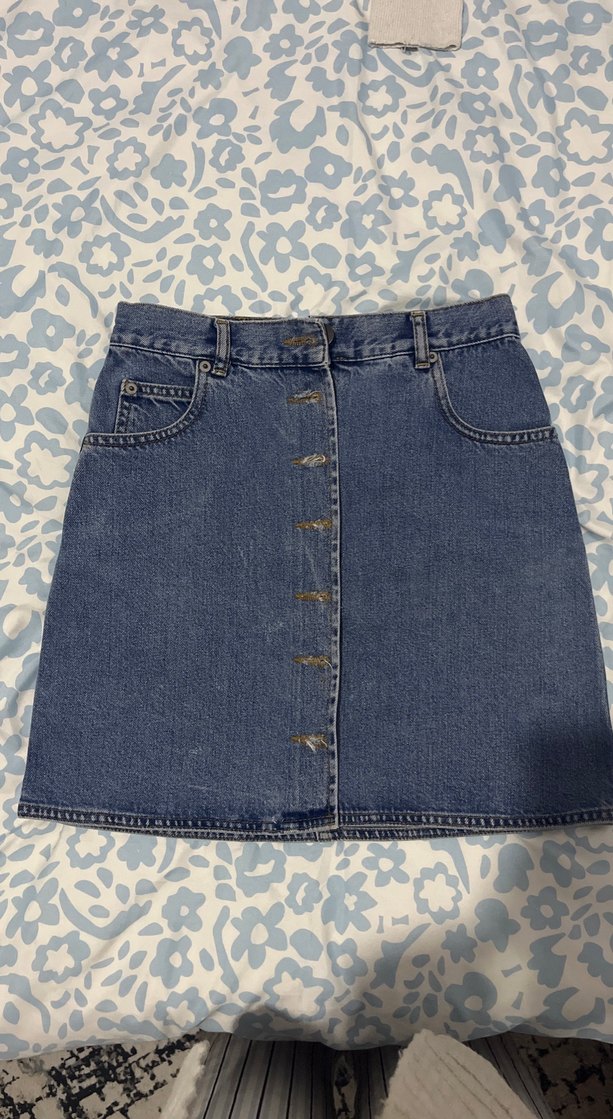Mavi kot kumaştan yapılmış, düğmeli ve bol kesim mini etek. Günlük kullanım için uygun midi boyda, rahat bir tarza sahip.
