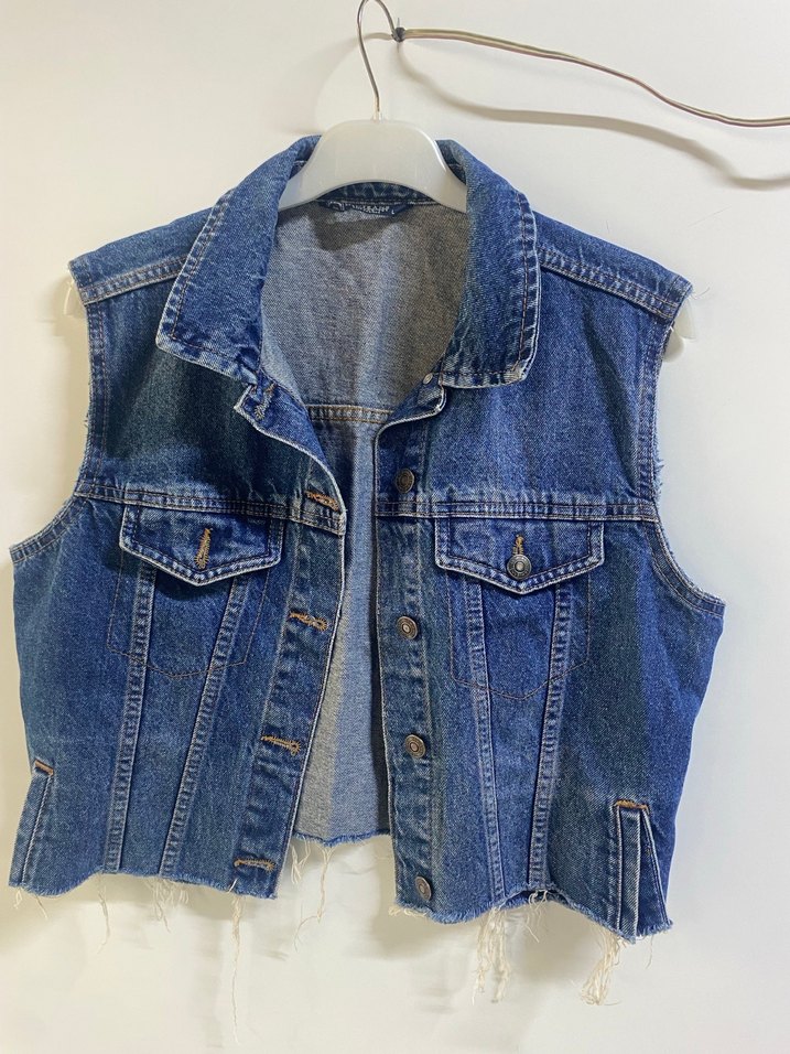 Düğmeli, mavi renkli, fitted kesim kot yelek. Kolsuz ve klasik yaka tasarımlı, günlük sokak stili için uygun, normal boyda ve kesik etek uçlu.