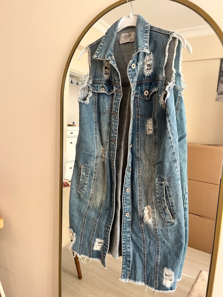 Düğmeli, askısız yaka ve bol kesim kot yelek. Normal midi boyda, yıpranmış detaylarla sokak stiline uygun.