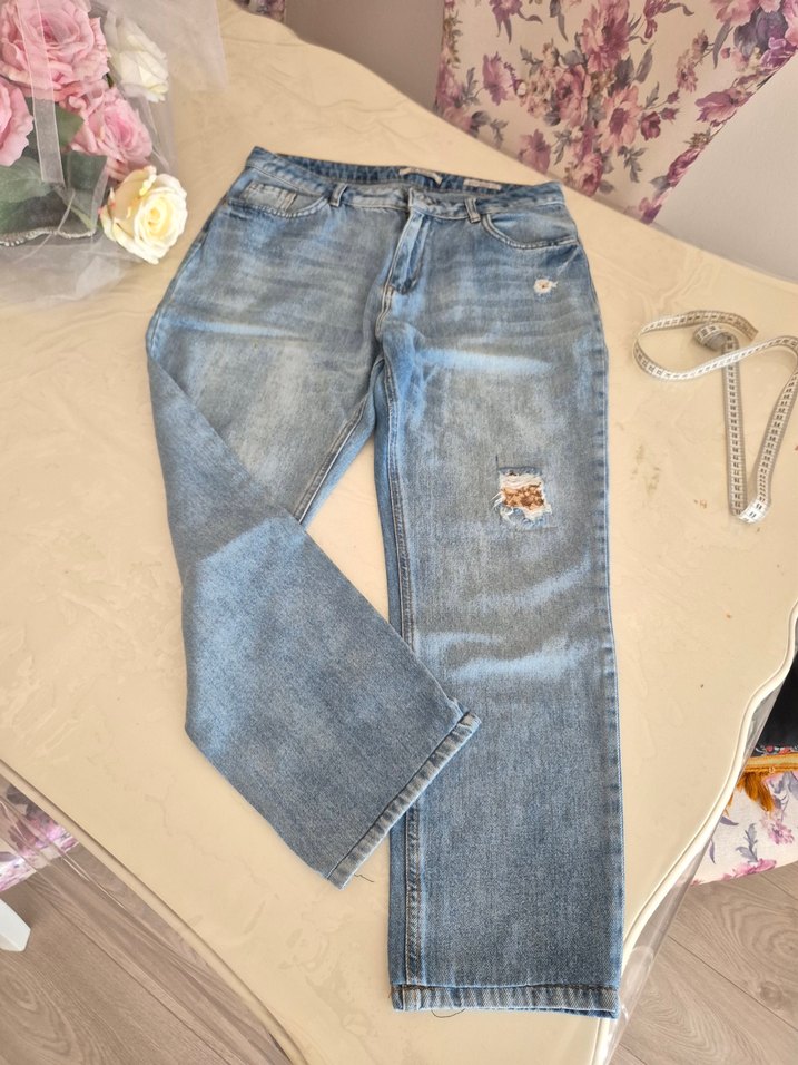 Düğmeli, pastel mavi renkte, normal boy loose fit kadın kot pantolon. Sokak tarzına uygun, günlük kullanıma ideal, küçük yırtık detayı var.