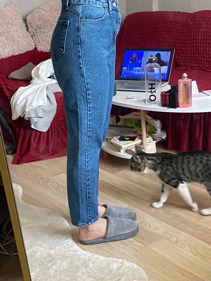 Düğmeli, gri tonlarda hafif batik desenli, midi boy, loose fit mavi kot pantolon. Rahat sokak stili için uygundur.