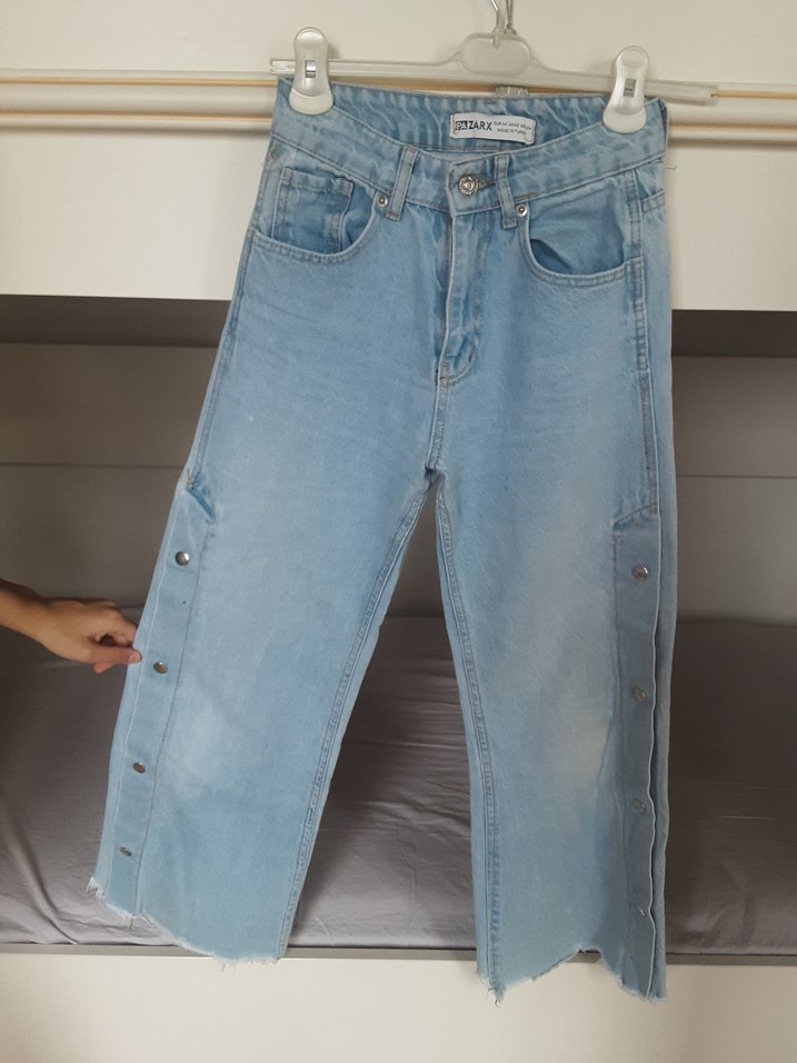 Pastel mavi renkte, düğmeli kapamalı, bol kesim ve midi boy kot pantolon. Yan düğme detayları ve ham kenarlarıyla günlük rahatlık sunar.