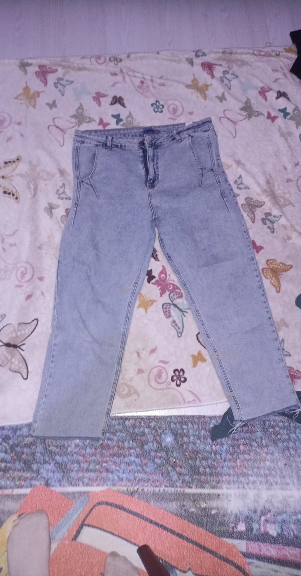 Düğmeli, midi boy, geniş kesim mavi kot pantolon. Düz gri tonuyla günlük sokak stili için uygundur.