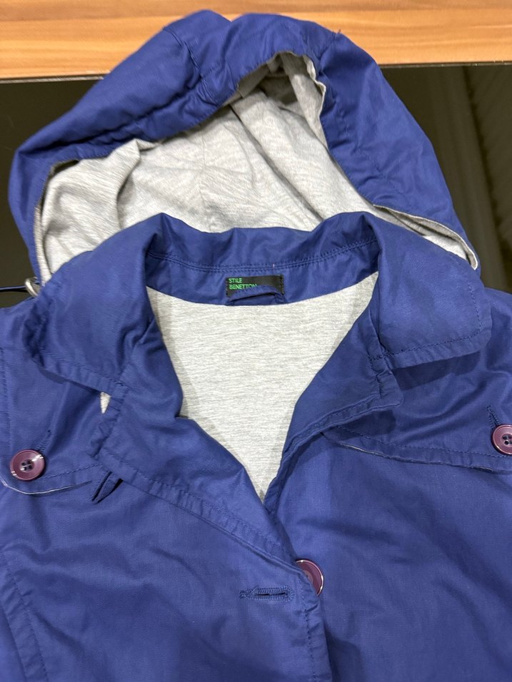 Düğmeli, mavi renk, midi uzunlukta, bol kesim ceket. Gri iç astar ve uzun kollu, dış mekan kullanımı için uygundur. Casual sokak stiline uygun.