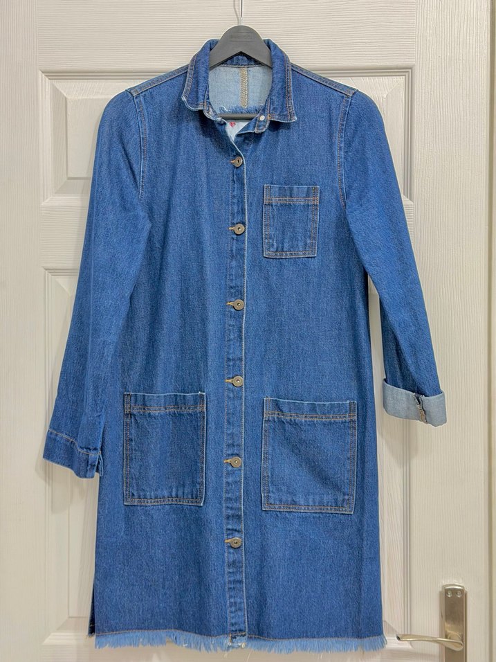 Düğmeli, mavi denim ceketin notched yakası ve uzun kolları vardır. Normal kesim ve üç ön cepli, rahat günlük kullanım için uygundur.