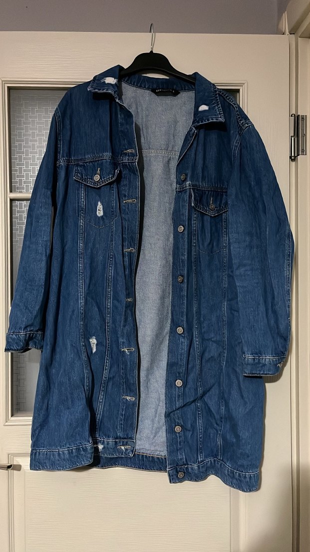 Düğmeli, bol kesim mavi denim ceket, kesik yaka ve uzun kolludur. Midi boyda, sade ve hafif yıpranmış detaylara sahiptir.
