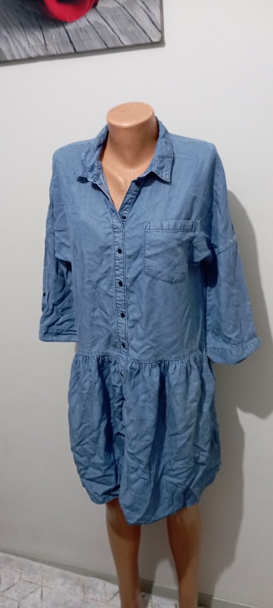 Yumuşak denim kumaştan, düğmeli ve göğüs cebi detaylı bol kesim midi elbise. Kısa kollu ve yakalı, günlük rahat stil için uygundur.
