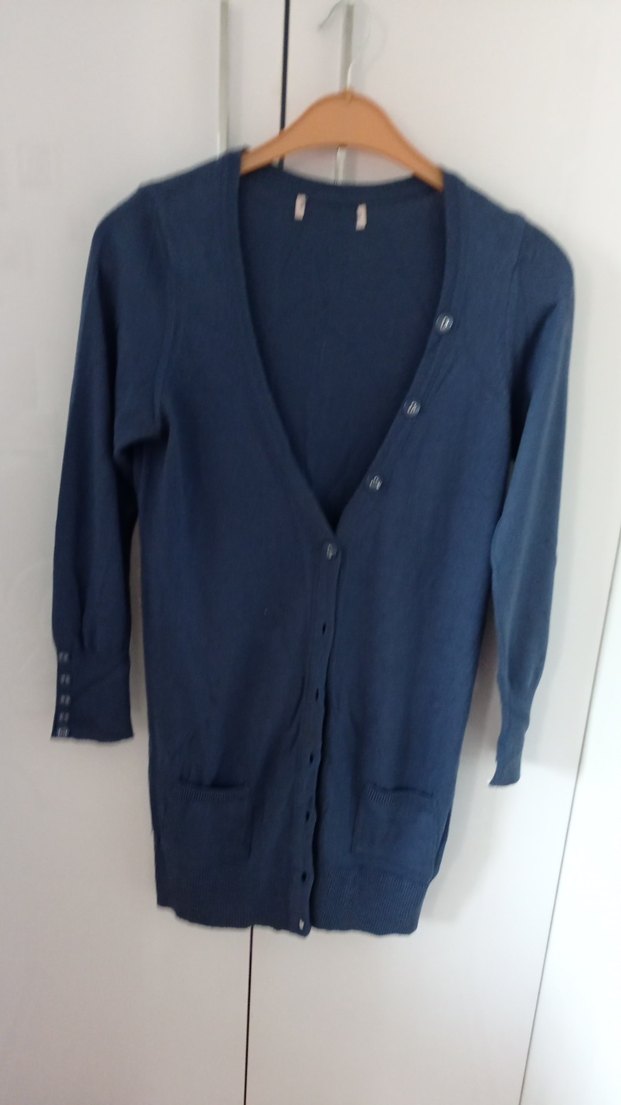Düğmeli, V yakalı mavi denim hırka, rahat kesimi ve uzun kollarıyla gündelik kullanıma uygundur. Desensiz, midi boyda normcore tarzda bir üründür.