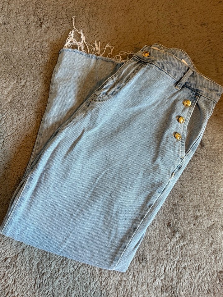 Düğmeli detaylı, uçları püsküllü mavi denim jean. Rahat kesimiyle gündelik kullanıma uygun pastel normcore tarzında.