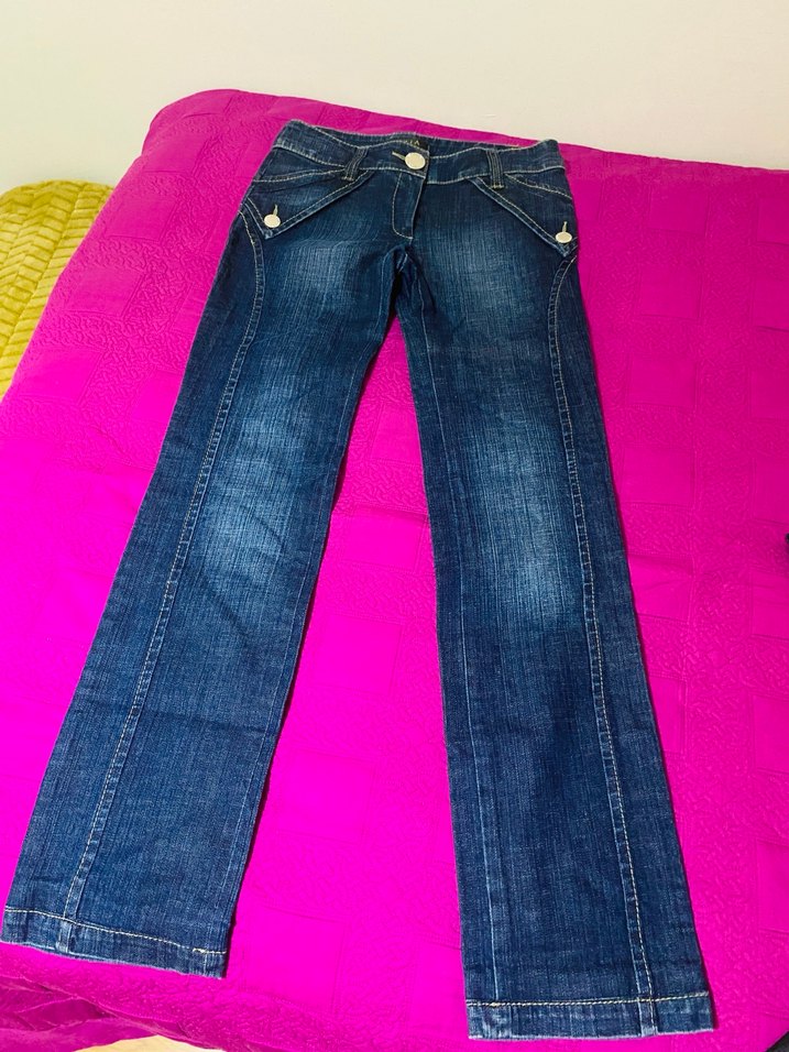Düğmeli detaylara sahip, fitted kesim mavi denim kot pantolon. Günlük rahat kullanıma uygun normcore tarzda. Bel ölçüsü 38 cm boy ölçüsü 96 cm