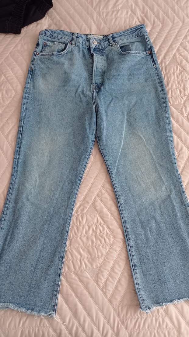 Düğmeli, mavi midi boy, regular fit denim pantolon. Günlük kullanıma uygun, desen içermeyen rahat bir model.