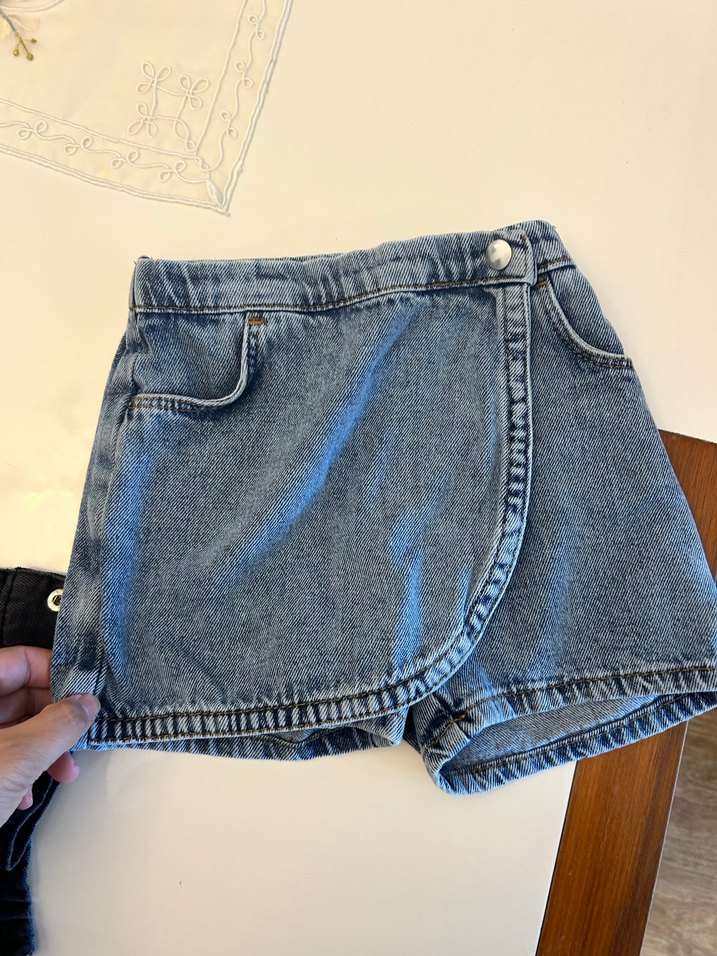 Düğmeli kapama ve bol kesimiyle mavi denim midi şort, günlük sokak stili için uygundur. Desensiz ve rahat kullanıma uygun.