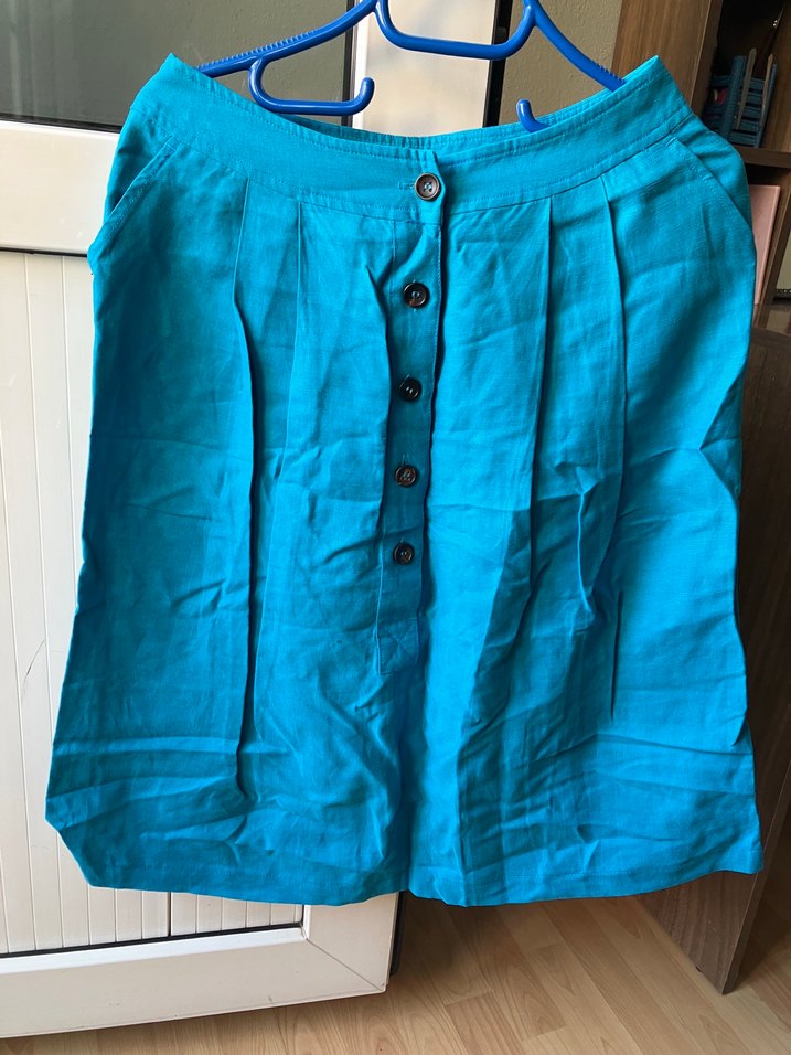 Yumuşak keten kumaştan, düğmeli, bol kesim, parlak mavi renkte, normal midi boyda hamile eteği. Minimalist ve bohem tarzda, günlük kullanıma uygun.