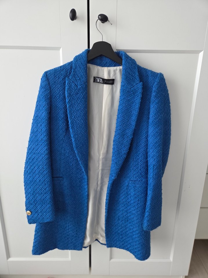 Düğmeli, mavi yün blazer, kırmalı yakalı ve uzun kolludur. Normal kesim ve midi boydadır, ofis için uygundur. Desensiz ve parlak dokudadır.