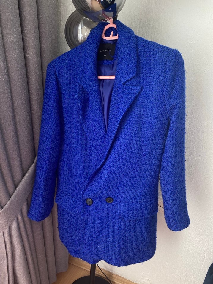 Düğmeli, mavi midi kadın blazer ceket, yün kumaştan, normal kesim ve uzun kolludur. Ofis kullanımı için uygundur. İade kabul etmiyorum