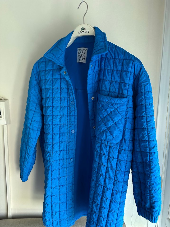 Düğmeli, uzun kollu ve mavi renkli bu kadın ceketi, normal kesim ve kesik yaka detayına sahiptir. Parlak kapitone dokusu rahat bir sokak stili sunar.