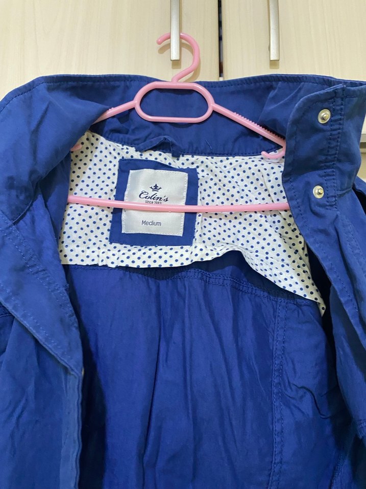 Mavi pamuklu ceket, düğmeli ve kesik yaka detaylıdır. Salaş kesim ve uzun kollu, baskılı iç astarıyla günlük sokak stili için uygundur.