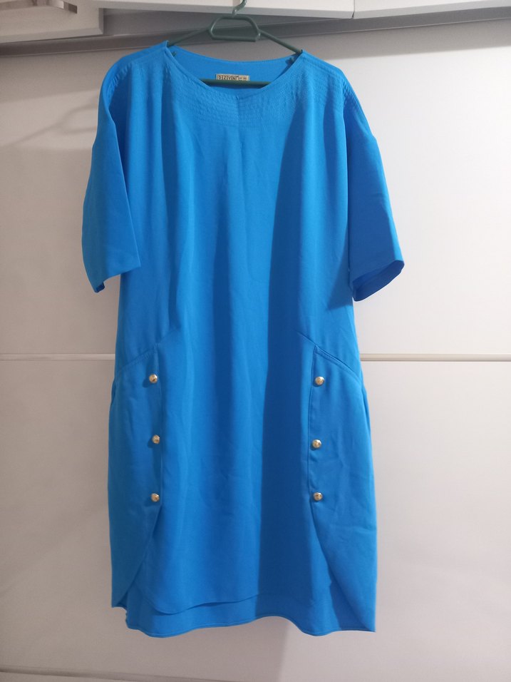 Mavi midi elbise, kısa kollu ve yuvarlak yaka ile rahat kesime sahiptir. Önde düğme detayları bulunur ve yumuşak sentetik kumaştan üretilmiştir.