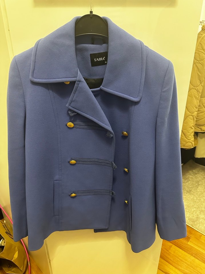Pastel mavi, düğmeli, normal boy midi kadın kaban. Uzun kollu, rçyumuşak sıcak kumaştan, ofis kullanımı için uygun.