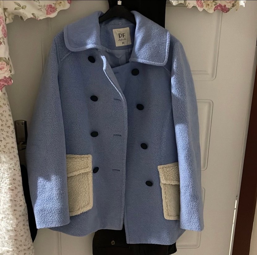 Pastel mavi renkte, düğmeli kadın kaban. Notlu yakalı, uzun kollu ve midi boyda. Yumuşak ve sıcak kumaştan, baskılı desenli ve rahat ceplidir. Rahat günlük stil için uygun.