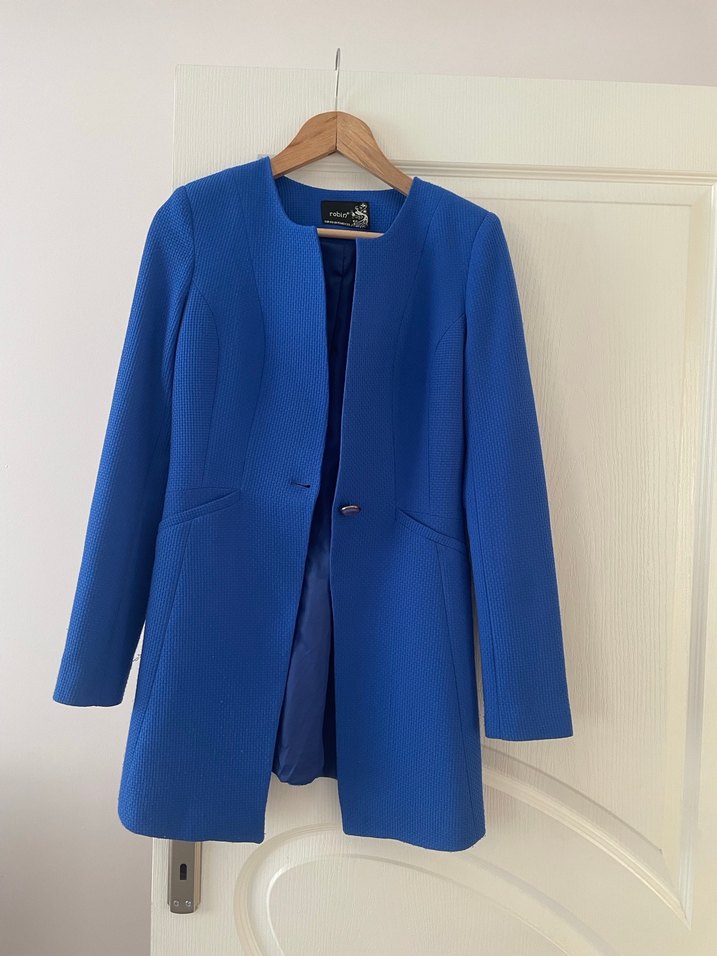 Düğmeli, mavi midi boy ceket, uzun kollu ve düz kesimdir. Ofis için uygundur