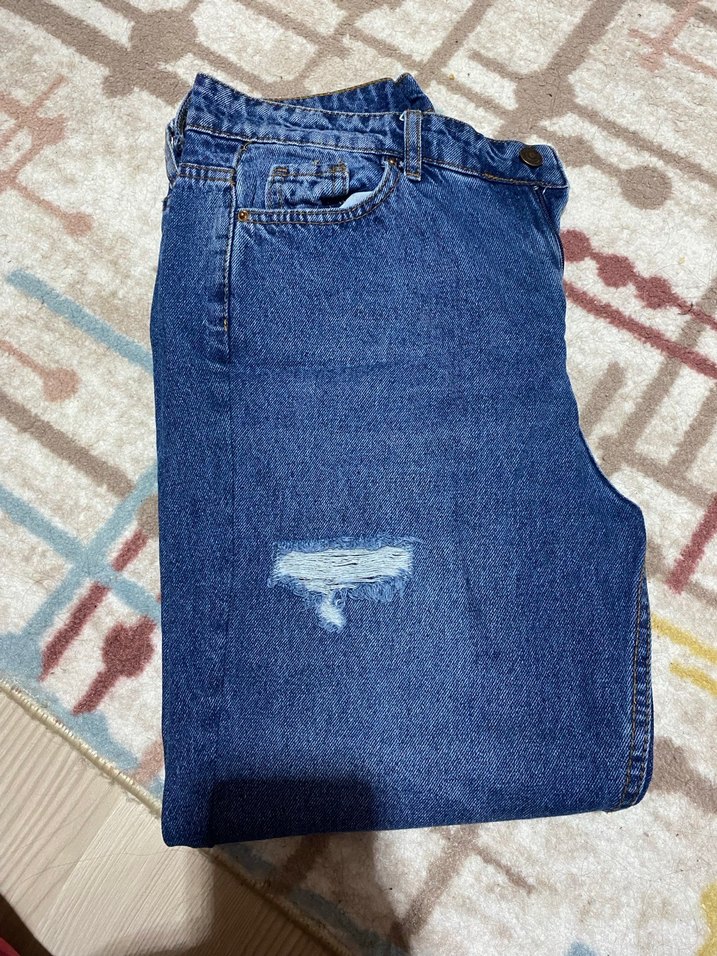 Düğmeli, mavi tonlarında, bol kesim denim kot pantolon. Hafif yıpranmış detay ve tie-dye deseniyle günlük sokak stiline uygun.