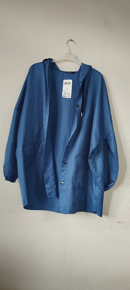 Bu bol kesim mavi yağmurluk, uzun kollu ve kesimli yaka detayına sahiptir. Parlak sentetik kumaştan yapılmış, düğmeli ön ve midi boyda, sokak stili için uygundur. ️