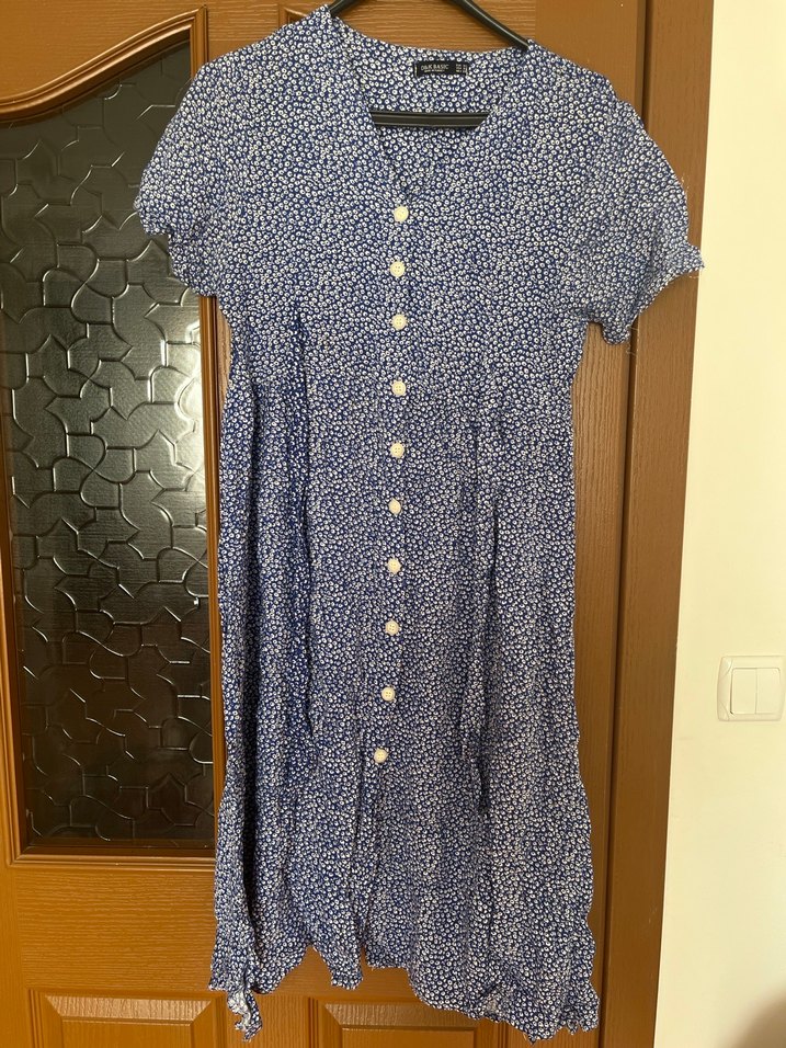 Mavi keten midi elbise, kısa kollu, V yakalı ve düğmeli. Salaş kesimiyle bohem tarzı yansıtıyor, günlük kullanım için uygun.