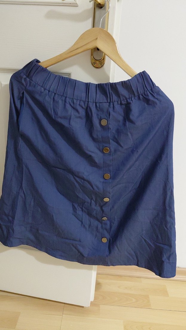 Düğmeli, parlak mavi keten midi etek, bol kesim ve günlük rahat kullanım için uygundur.
