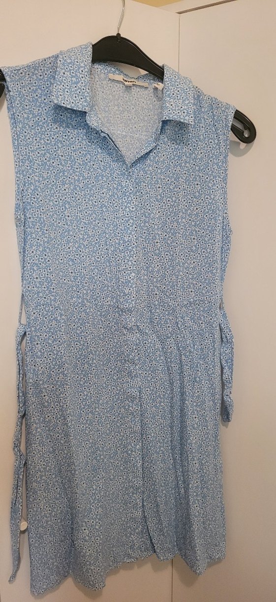 Kolsuz, yakalı ve düğmeli ön kısmı olan midi elbise. Yumuşak pamuklu kumaştan, bol kesim ve mavi hafif batik desenlidir.