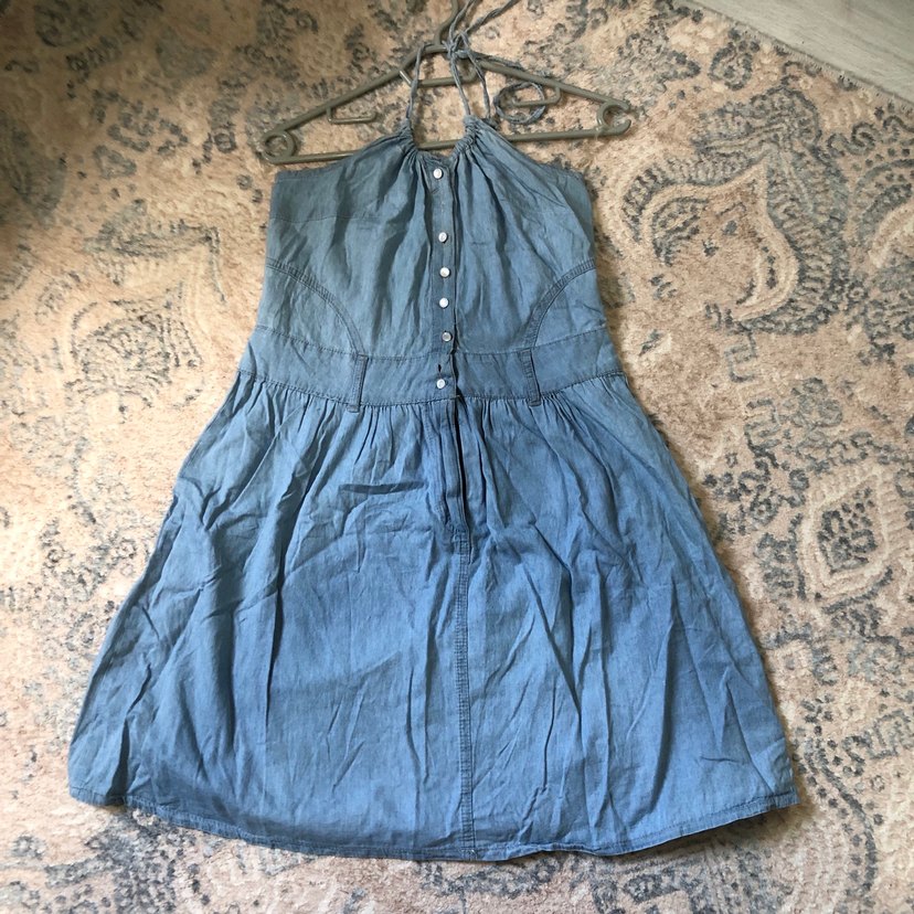Düğmeli, askılıksız yakalı, mavi kot midi elbise. Salaş kesimi ve bohem tarzıyla günlük kullanım için uygundur. Bir düğmesi eksiktir.