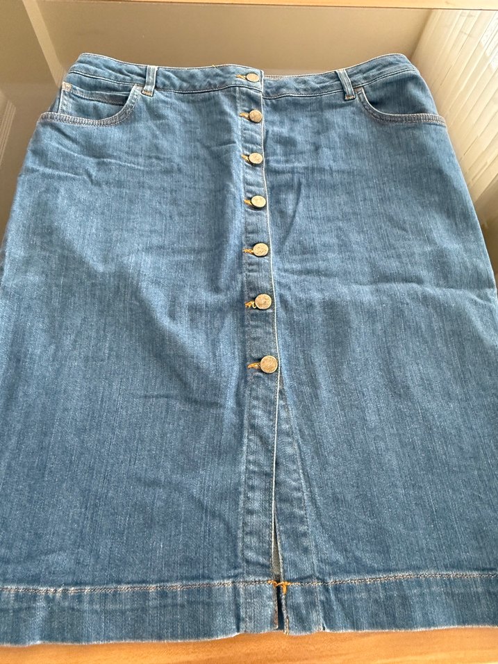Parlak mavi kot eteği, düğmeli ön detay ve bol kesime sahiptir. Normal midi boyda, günlük rahat kullanıma uygundur.