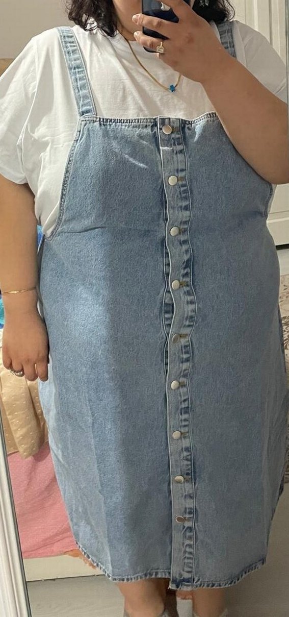 Düğmeli, bol kesim midi uzunluğunda kot etek. Pastel mavi renkte, günlük kullanıma uygun 54bedendir