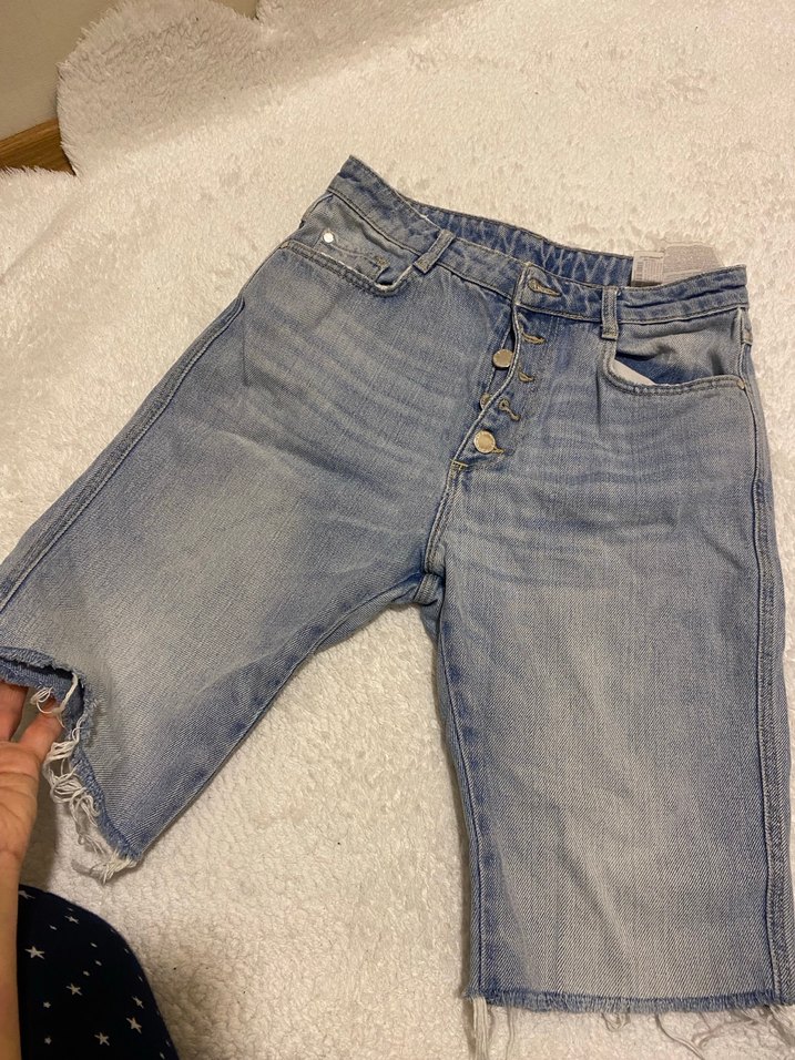 Düğmeli, bol kesim mavi kot midi şort. Günlük kullanım için rahat ve sokak tarzına uygun.
