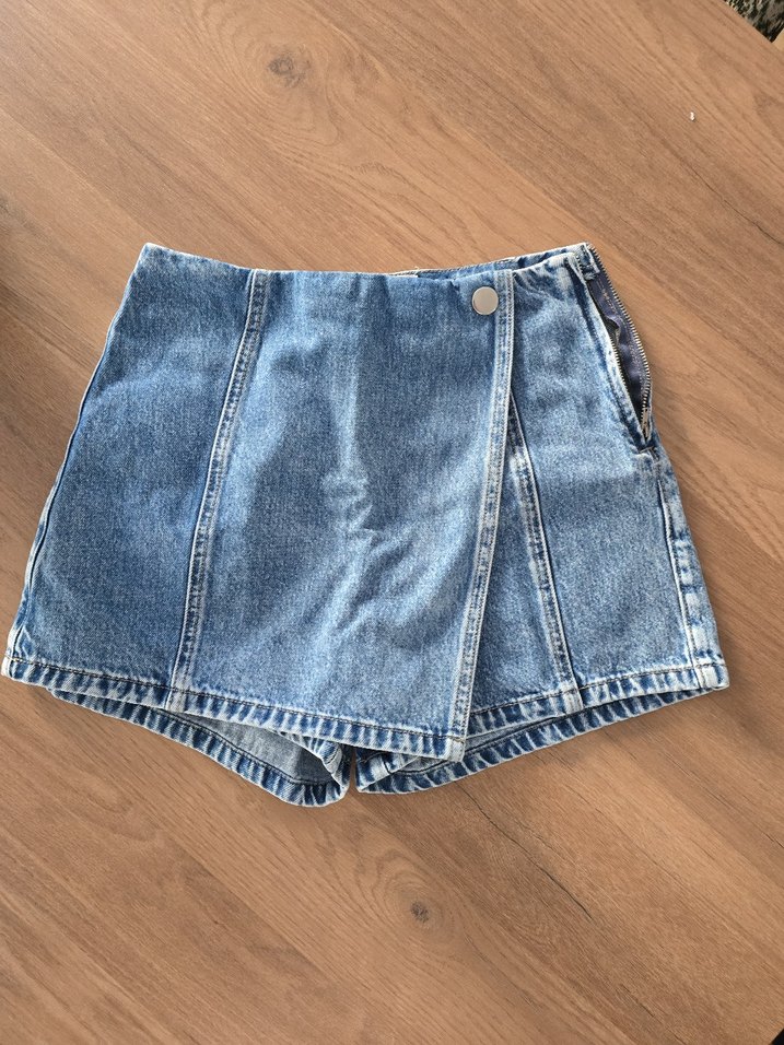 Düğmeli ön sargılı detaylı, bol kesim mavi mini denim şort. Günlük kullanım için rahat, desensiz ve sokak stili uyumlu.
