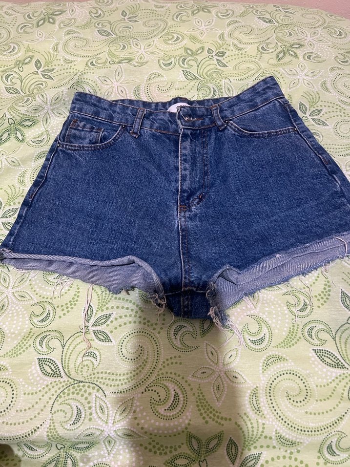 Düğmeli, rahat kesim mavi mini denim şort, günlük sokak modası tarzında.