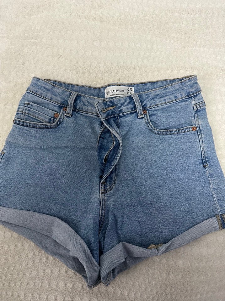 Düğmeli, bol kesim mavi mini denim şort. Katlanmış paçalar ve desensiz tasarım, rahat sokak stili için uygundur.