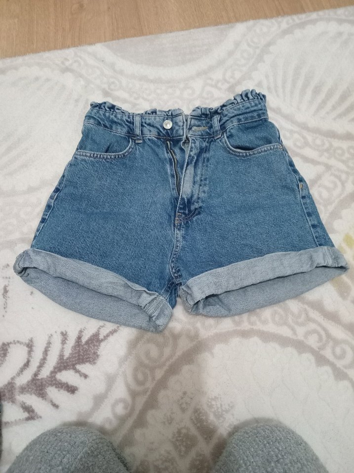 Düğmeli, bol kesim mavi denim mini şort, katlanmış paçalar ve rahat sokak stiliyle uyumlu.