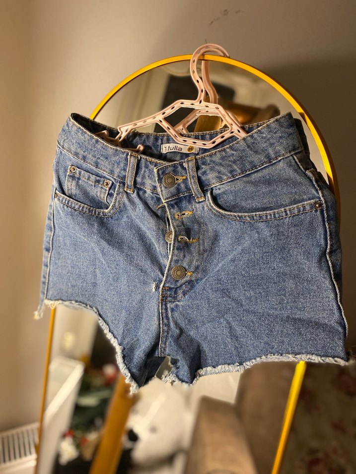 Düğmeli kapama ve bağlama desenli, rahat kesim mavi mini denim şort, günlük sokak stili için uygundur.