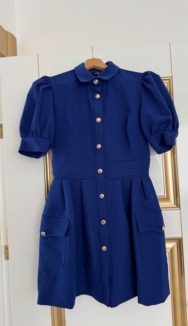 Düğmeli, kısa kabarık kollu, parlak mavi mini elbise. Notlu yaka ve iki cep ile modern klasik ofis tarzı için uygun. Bir kez kullanıldı. Adl marka S beden