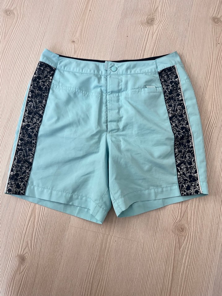 Düğmeli, pastel mavi renkte, yanları desenli, dar kesim kadın mayo şortu. Sokak stili ve athleisure konforunu plajda birleştirir.