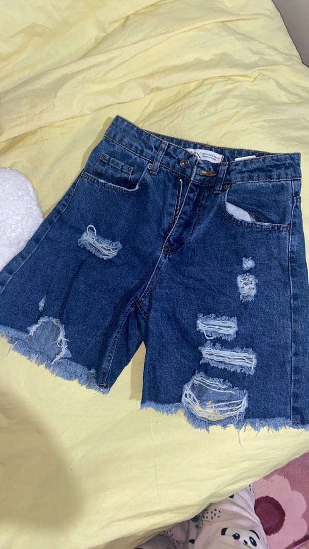 Düğmeli, parlak görünümlü mavi mini kot şort. Rahat kesimi ve sokak stiliyle günlük kullanıma uygundur.