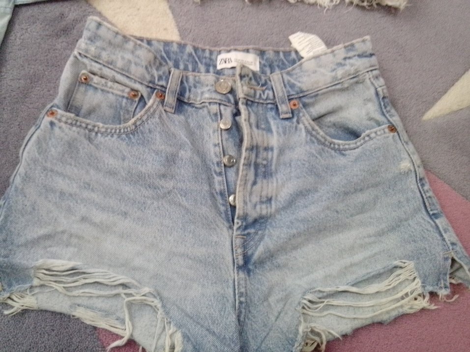 Düğmeli, bol kesim mavi denim mini şort, yıpranmış detaylı, günlük rahat sokak stili için uygun. Desensiz ve pastel tonlarda.