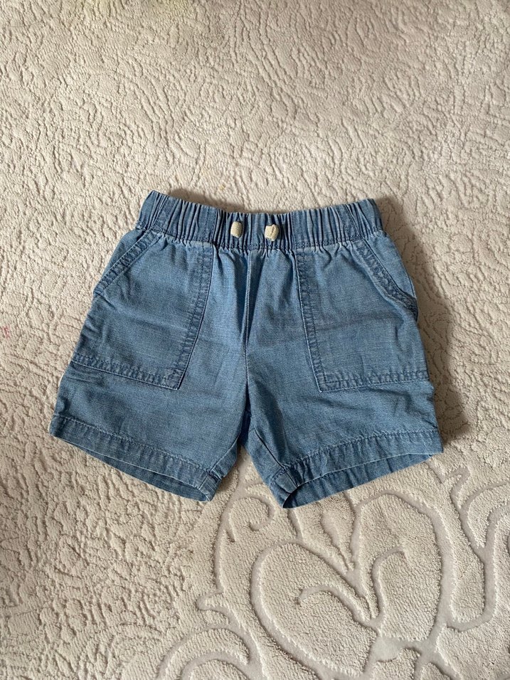 Düğmeli ön ve lastikli bel detaylı, rahat kesim mavi mini kot şort. Günlük dış mekan kullanımı için uygundur.