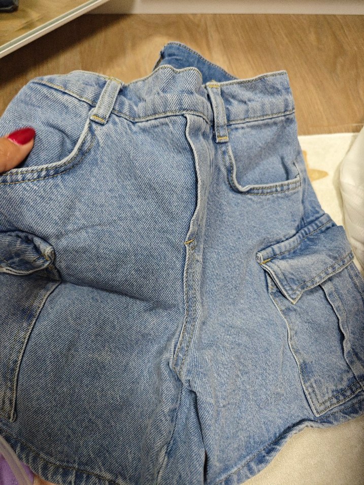 Açık mavi renkli, düğmeli ve bol kesim mini kot şort. Günlük sokak modasına uygun rahat bir tasarıma sahiptir.