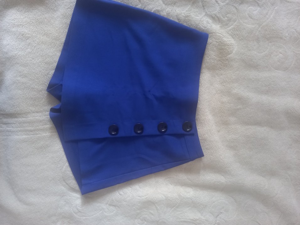 Düğmeli yan detaylı, parlak mavi renkte, sentetik kumaştan yapılmış, vücuda oturan mini şort etek. Minimalist tarzda, günlük kullanıma uygun. bel 36 cm.boy 37 cm.