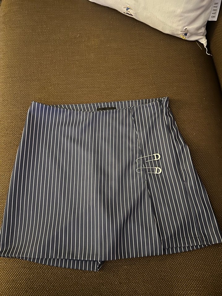 Düğmeli, çizgili mavi mini etek, rahat kesimi ve sentetik kumaşıyla günlük sokak stiline uygun.