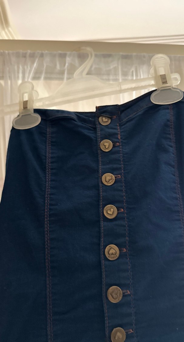 Düğmeli ön kısmı ve parlak mavi kot kumaşıyla, uzun ve dar kesim mini Günlük kullanıma uygun bohem tarzda.