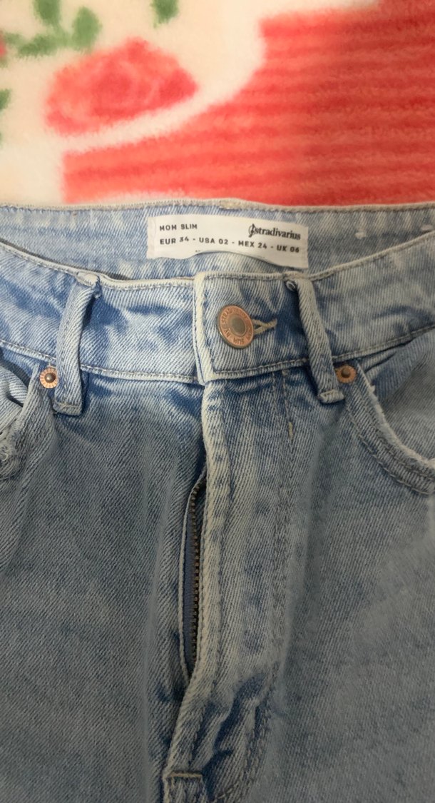 Düğmeli, baskılı detaylara sahip, mavi mom slim kesim denim pantolon. Günlük rahat kullanıma uygun normcore tarzda. Marka: Stradivarius.